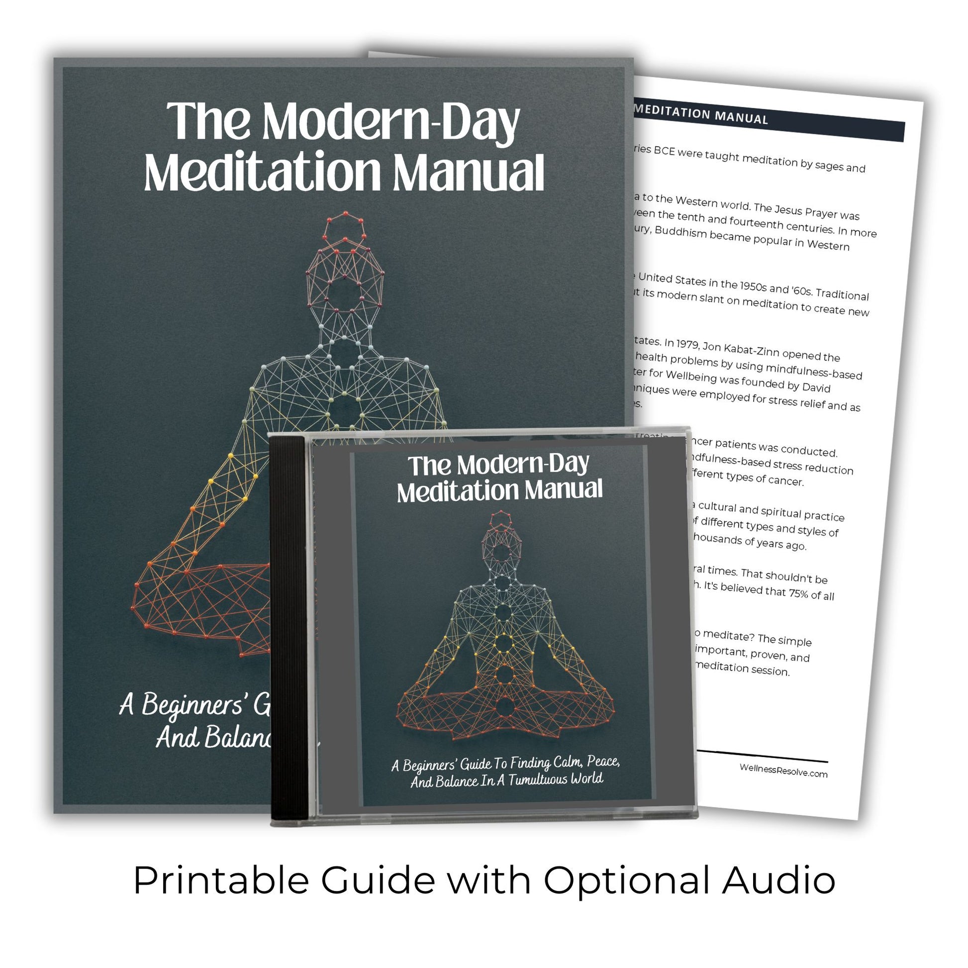 The Modern-Day Meditation Manual & Workbook that include optional audio files of the manual so you can listen on the go! It's a meditation guide for beginners that teaches you how to create peace of mind and calm in just a few minutes.